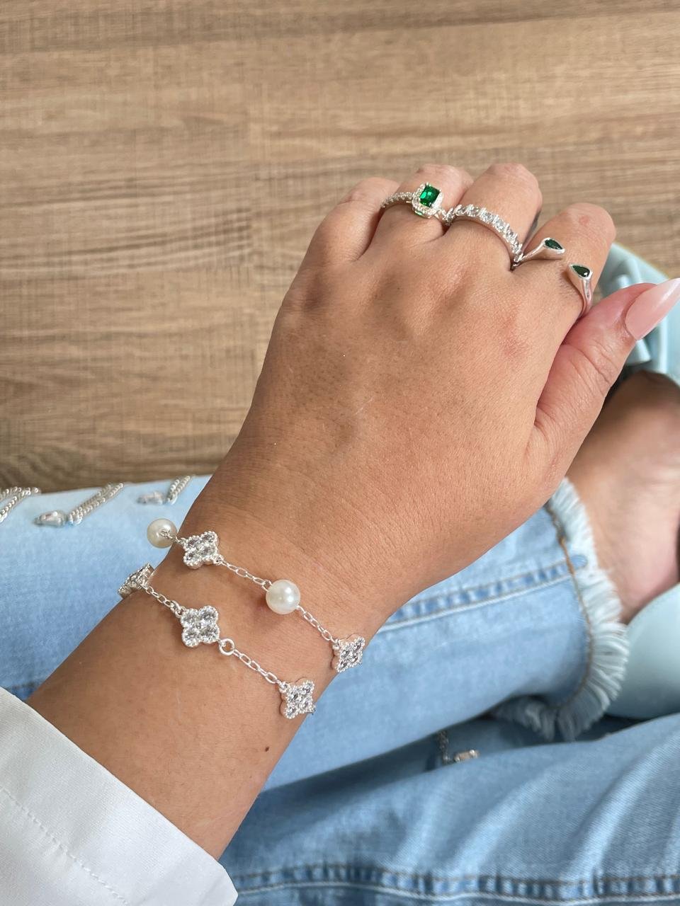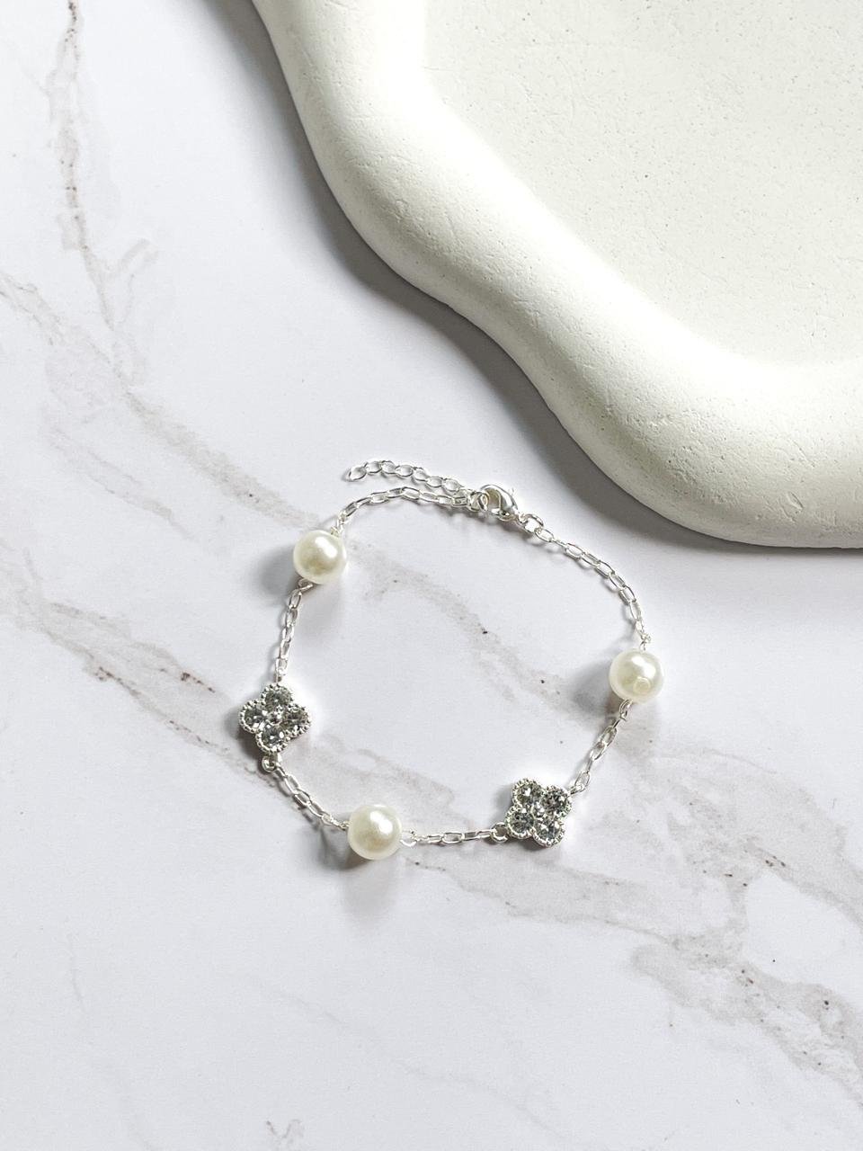 Pulseira com trevos em pedraria intercalados com pérolas.